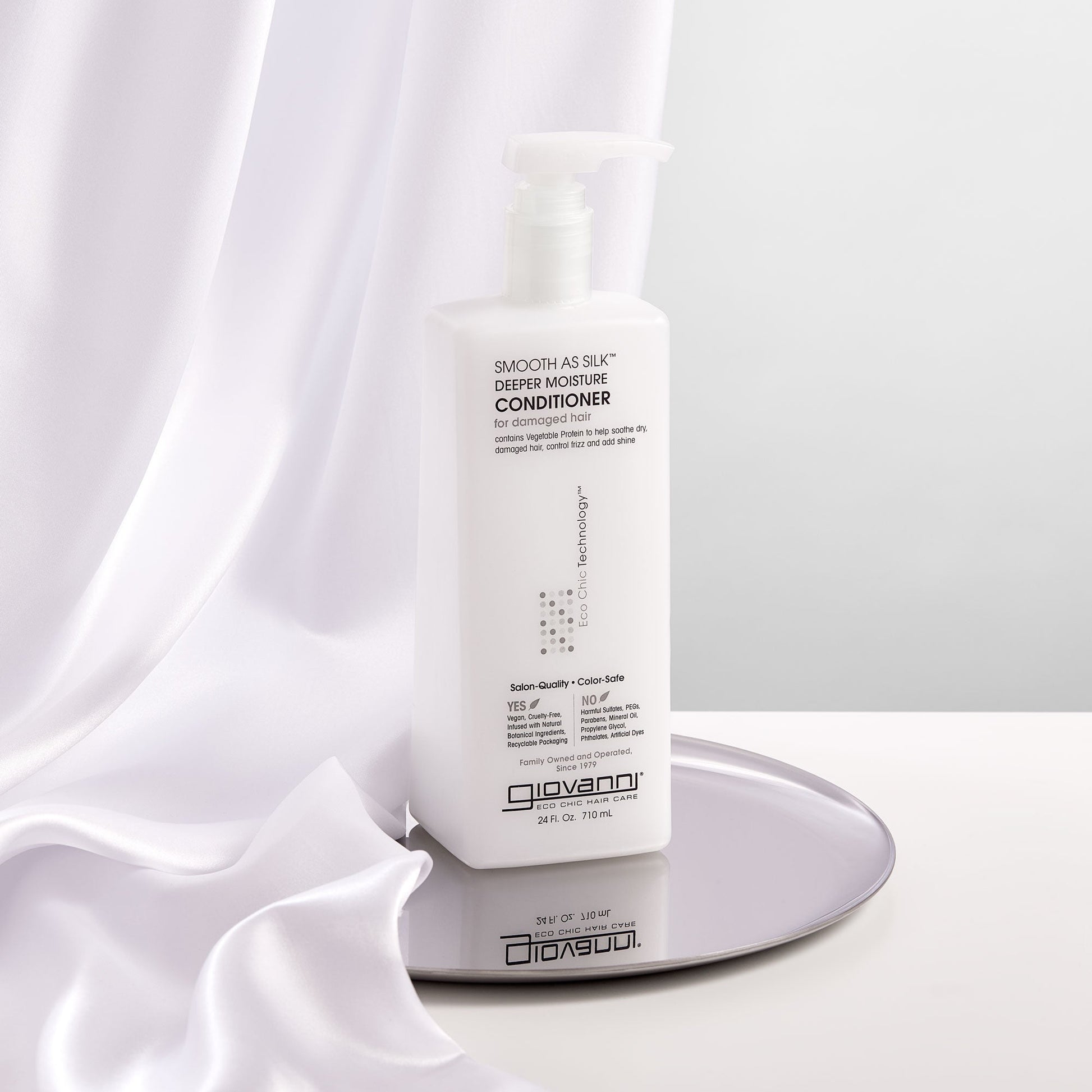Silk — it has the most incredible feel, the most incredible texture. It makes you feel sexy. Desirable. SMOOTH AS SILK™ Deeper Moisture Conditioner from Giovanni makes your hair feel so smooth, so silky, so amazingly detangled. This color-safe deep conditioner works only where needed to create a silky-smooth palette. Renewed and ready for your own unique kind of style. SMOOTH AS SILK™ provides smooth moves indeed.